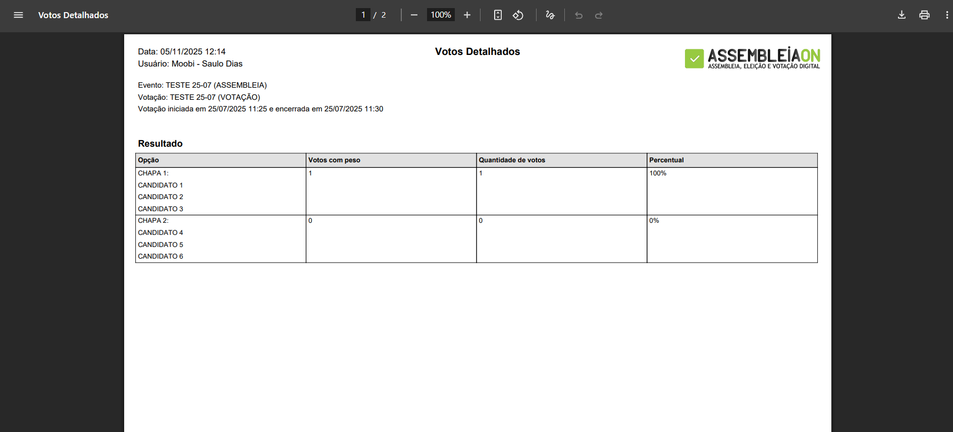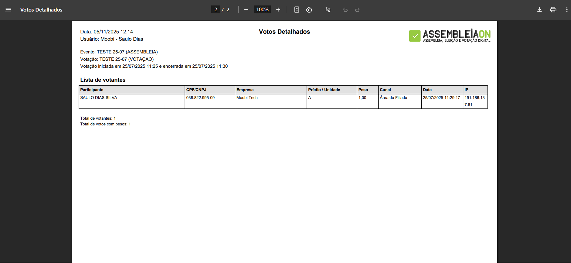 - Relatórios detalhados de participação, abstenção e votos.