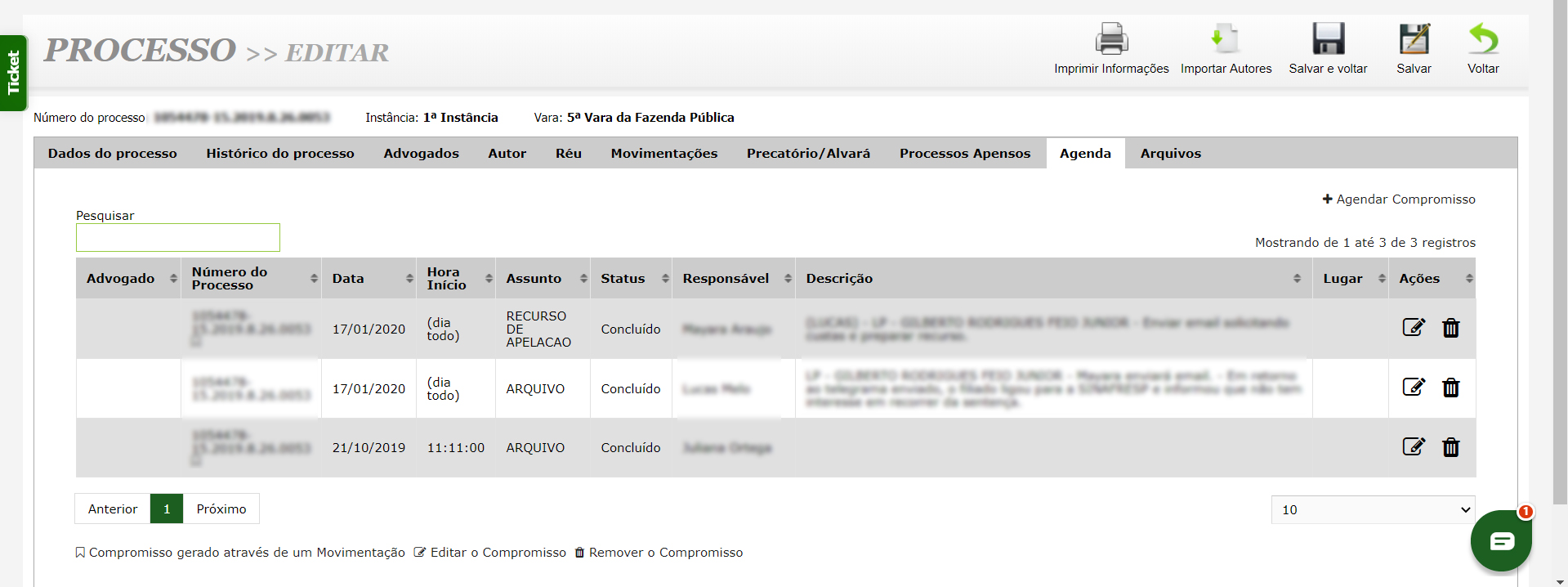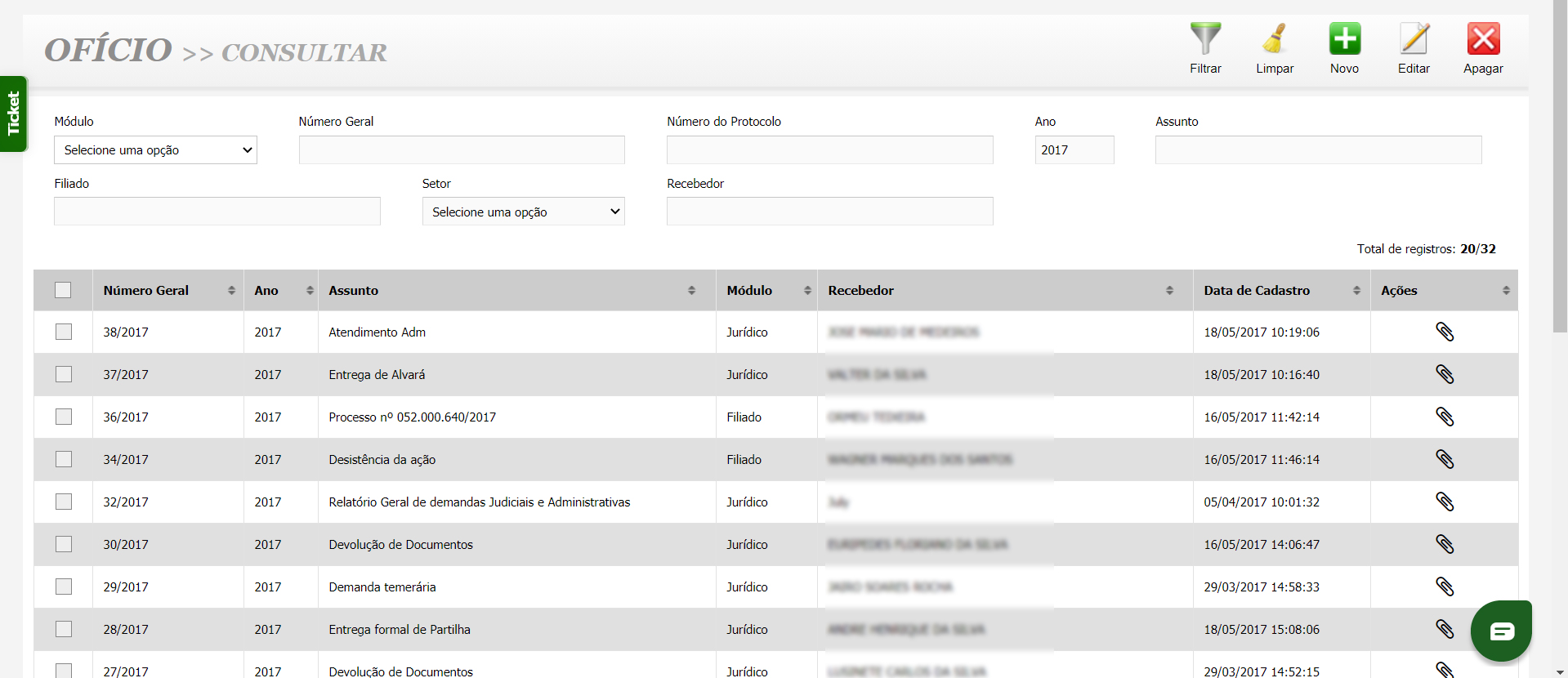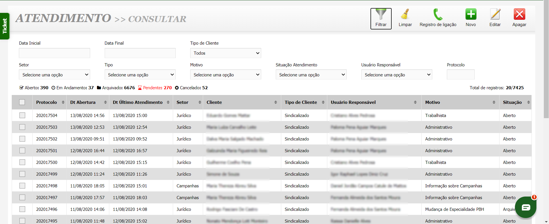 - Integração com o Módulo Jurídico: Visualize processos jurídicos em andamento diretamente na tela de atendimento e segmente a visibilidade das solicitações para garantir o sigilo quando necessário.