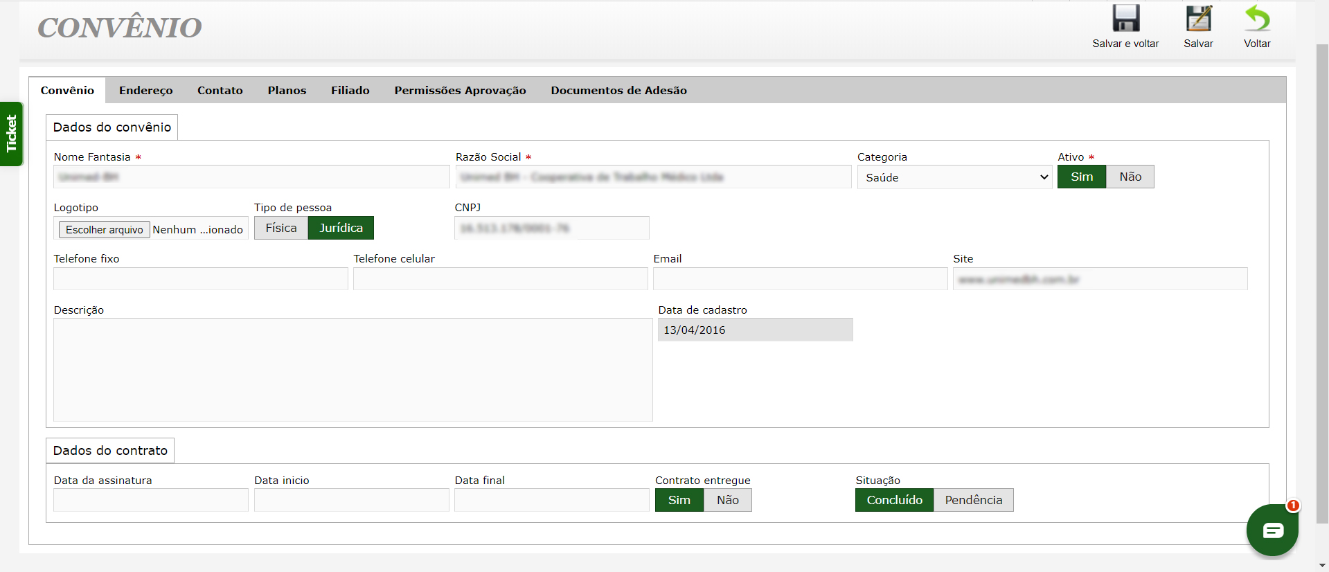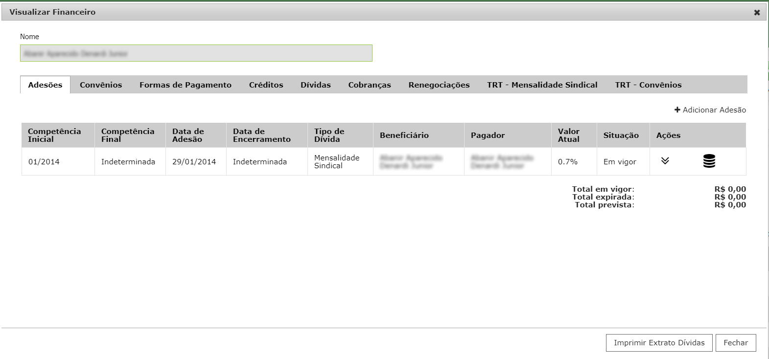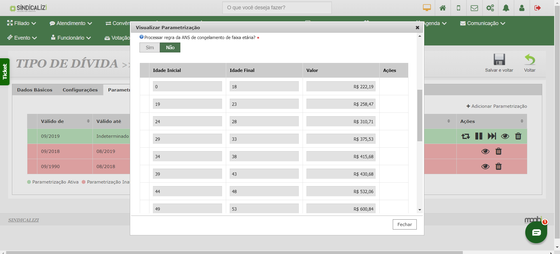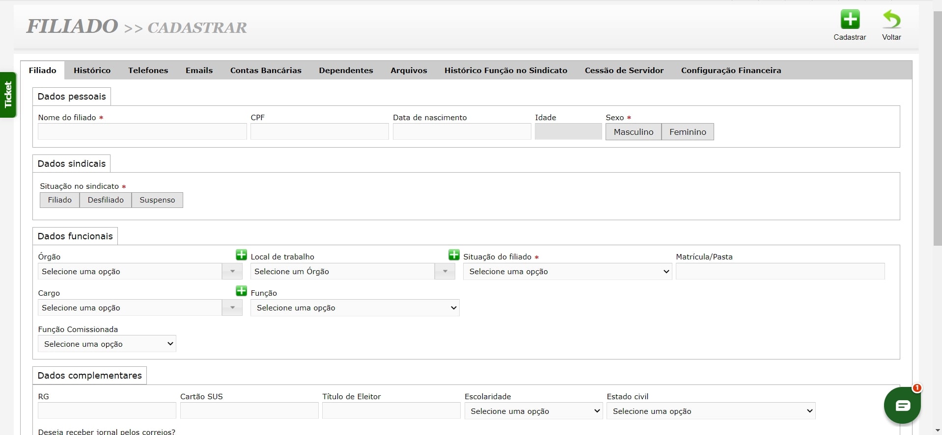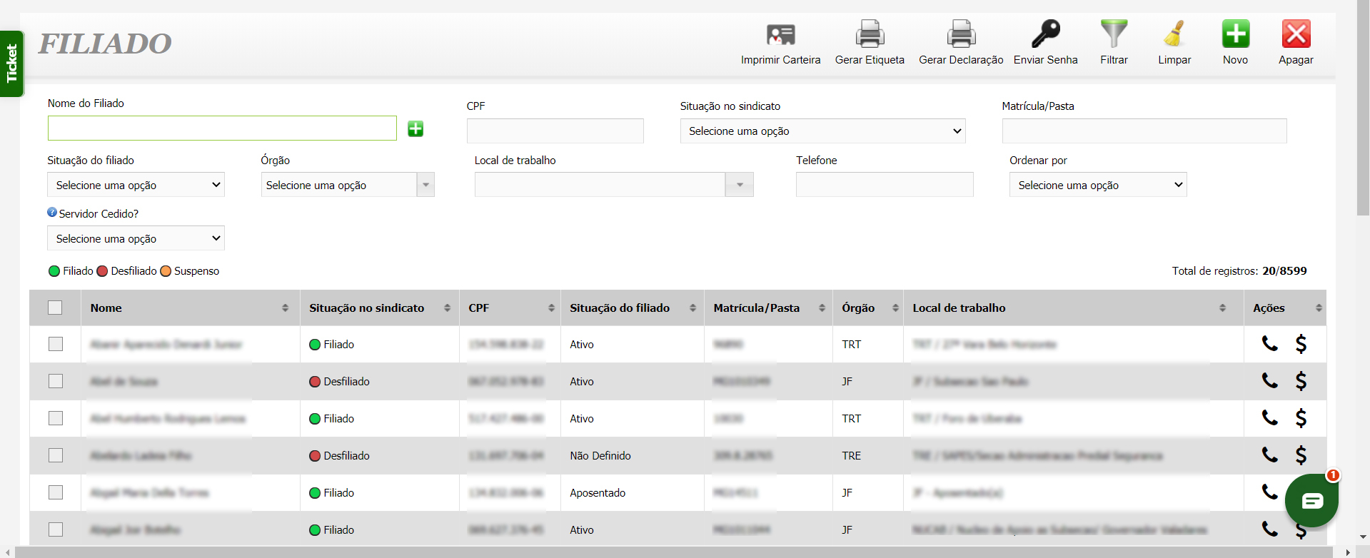 - Gestão completa de dados: gerencie informações de filiados, dependentes e empresas, incluindo contatos, vínculos e situação funcional.