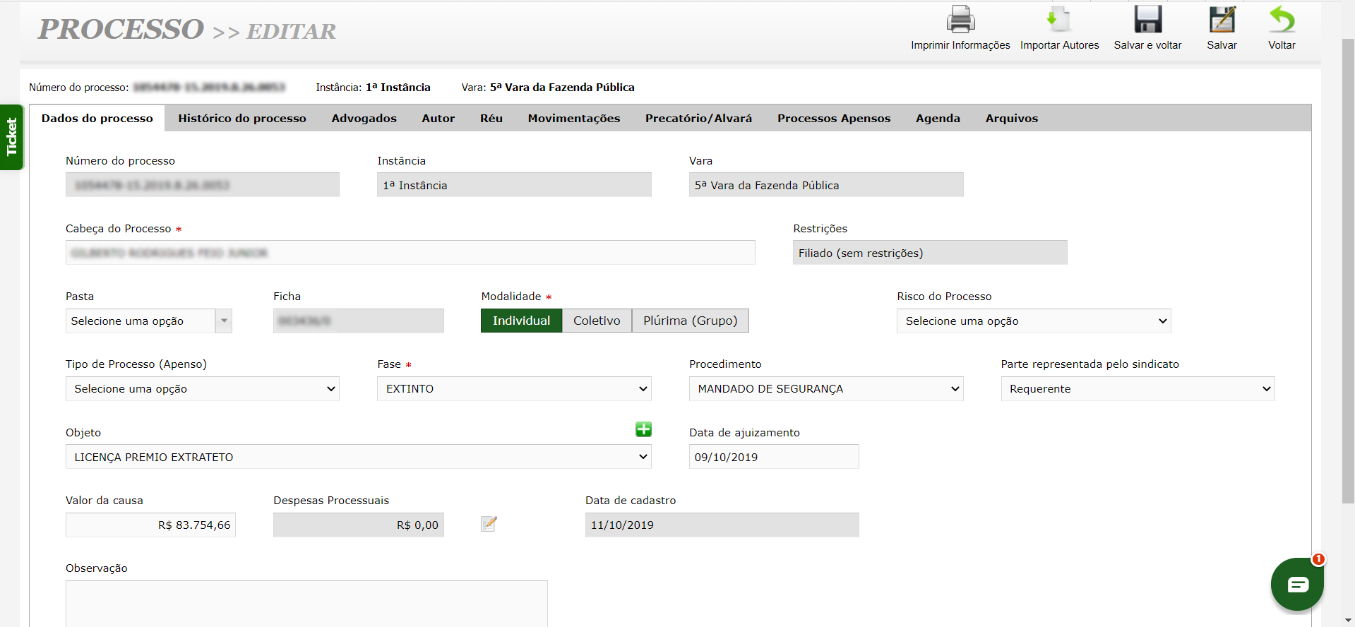 - Gestão Completa de Processos: Cadastre e acompanhe processos individuais e coletivos, vincule advogados, digitalize documentos e organize seu acervo físico com facilidade.
