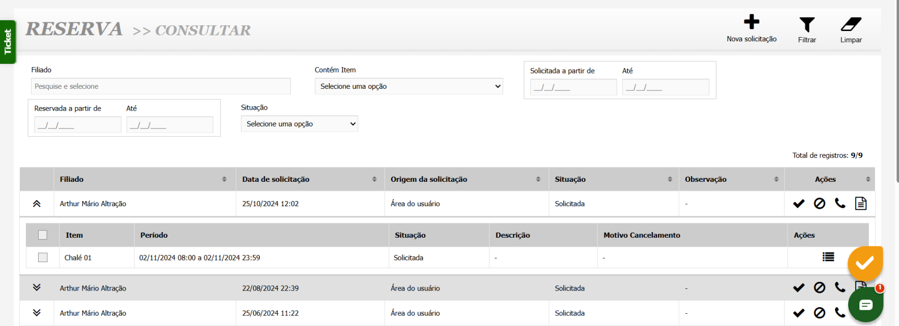 - Relatórios Completos: Emita relatórios detalhados das reservas por filiado, data e recurso, para uma visão completa da utilização dos espaços da entidade.