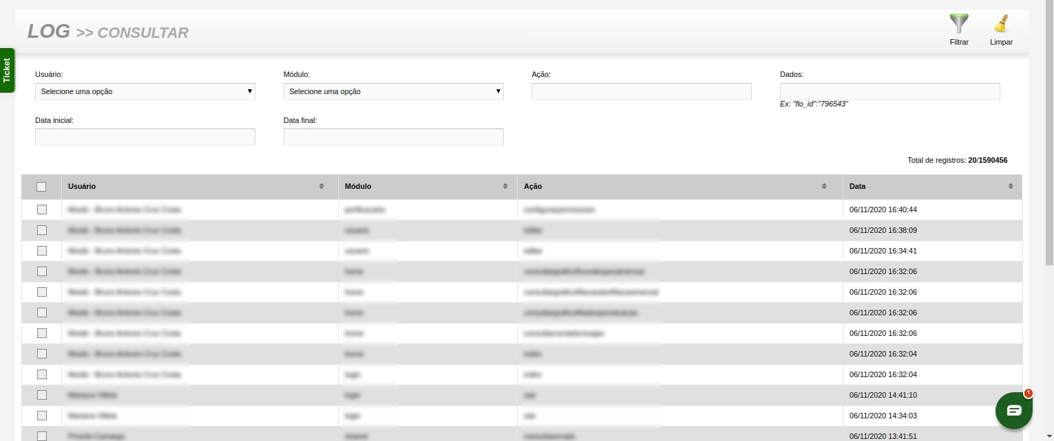 - Trilha de Auditoria Completa: Rastreie todas as ações realizadas no sistema. Nosso módulo registra o usuário, data, hora e IP, garantindo uma trilha de auditoria completa para total transparência.